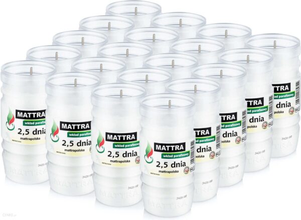 Wkłady parafinowe całoroczne P-4opakowanie 20 sztukWkłady parafinowe MATTRA wykonane są z najwyższej jakości parafin, a ich produkcja odbywa się pod czujnym okiem wykwalifikowanej kadry inżynierskiej.Stan: fabrycznie nowy, oryginalnyCechy produktu:czas palenia: 2,5 dnia*typ wkładu: parafinowy**wkłady wypalają się równomiernie do końca, nie niszcząc szkła zniczowegobrak kopcenia w każdym rodzaju szkłaetykiety odlepnewysokość 11 cmśrednica 5,6 cmspecyfikacja jakościowa: produkt certyfikowany PN-C-98000:2005GWARANTOWANY CZAS PALENIA* Czas palenia zależy od warunków pogodowych (np. temperatura, siła wiatru) i wynosi od 1,5 do 2,5 dnia. Wkład do zniczy przeznaczony do użytku zewnętrznego w lampionach, prosimy przestrzegać załączonych symboli.**Wkłady parafinowe MATTRA z gwarantowanym czasem palenia to połączenia tradycji z innowacyjnymi rozwiązaniami technologicznymi, produkowanymi z dbałością o środowisko. Optymalna temperatura wypalania wkładów parafinowych wynosi od -10C do +35C.Temperatury podane w opisie aukcji, dotyczą temperatur odczuwalnych w miejscu wypalania się wkładu. Zdjęcia zamieszczone na aukcjach mają charakter pokazowy, w rzeczywiści produkty mogą różnić się od stanu faktycznego odcieniem czy wysokością zalewy, w zależności od aktualnie dostarczanych surowców. Zamieszczone informacje w tytule aukcji posiadają wartości zaokrąglone, szczegółowe informacje znajdują się w opisie aukcji.Wkłady do zniczy MATTRA posiadają oryginalne tuby, w znacznej części produkowane z tworzywa pochodzącego z recyklingu. Istotną cechą produktu jest estetyka wykonania, charakteryzują się one bowiem, przyjemną dla oka linią i solidnością wykonania.Tuby charakteryzują się podwyższoną odpornością na działania wysokich temperatur, podczas wypalania się wkładów do zniczy.Znakiem rozpoznawczym wkładów do zniczy MATTRA jest długi czas palenia, równy i jasny płomień, oraz czystość wypalania. Dzieję się tak, ponieważ wkłady wykonane są z najwyższej jakości parafin o powtarzalnym składzie, oraz wysokich temperaturach krzepnięcia.Wkłady do zniczy MATTRA charakteryzują się wysoką powtarzalnością jakości w różnych warunkach atmosferycznych, przez co sprawdzają się nie tylko w takie dni jak: Wszystkich Świętych, Boże Narodzenie czy Wielkanoc, ale również we wszystkich innych okolicznościach oraz porach roku.Prawdziwy płomień wkładów do zniczy, to prawdziwy Czas Pamięci o naszych bliskich.