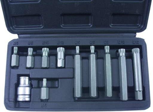 Zestaw 10 bitów 12-kątnych typu SPLINEW skład zestawu wchodzi 5 sztuk bitów 12-kątnych SPLINE. Każdy bit występuje w dwóch wariantach. Ułatwiającym precyzyjne manewrowanie i pracę w ciasnych miejscach – krótkim (3 cm) oraz długim, pozwalającym dotrzeć do trudnodostępnych wkrętów (7,5 cm). Razem w zestawie znajduje się 10 kluczy.Do tego w zestawie dodaliśmy adapter do kluczy nasadowych.Zestaw doskonale sprawdzi się w warsztacie i garażu.
