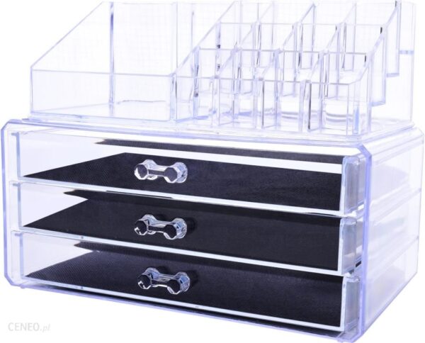 Kosmetyczny organizer czteropiętrowy, trzy wyjmowane przezroczyste szuflady z czarną tkaniną w środkudla bezpiecznego przechowywania kosmetyków, górna zdejmowana część podzielona jest na 16 przegródek.Idealny do przechowywania i uporządkowania szminek, lakierów do paznokci, fluidu, pudru, tuszów do rzęs, kredek,pędzli, ale także naszyjników, pierścionków, bransoletek, a nawet spinek, grzebieni i innych drobiazgów domowych …Można w nim przechowywać praktycznie wszystko, od kosmetyków, pędzli po leki czy biżuterię …“Grubościenne, hartowane tworzywo sztuczne…”Materiał: hartowane, przezroczyste tworzywo sztuczneWymiary: 24 x 14 x 18,3 cm, wewnętrzne szuflady: ok. 21 x 12,5 x 2,8 cm.