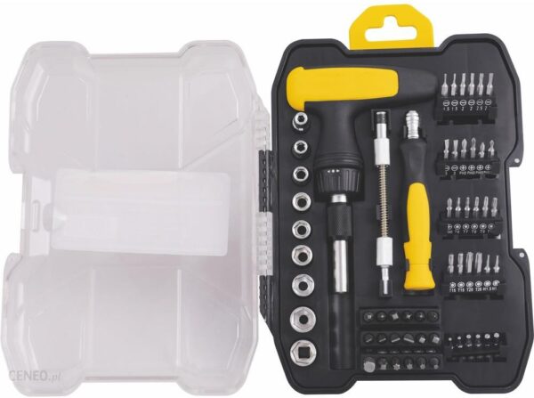 Bity 4 mm: 30 sztukBity 6 mm: 17 sztukAdapter: 1 sztukaElastyczna nasadka: 1 sztukaGłowice nasadowe 1/4: 9 sztukWkrętak z grzechotką 6 mm: 1 sztukaWkrętak do bitów 4 mm: 1 sztuka