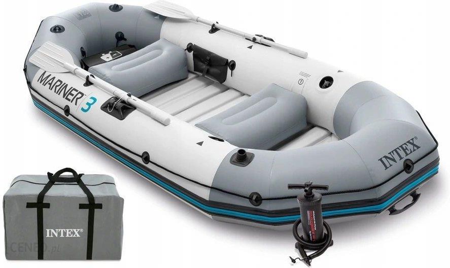 INTEX Ponton dmuchany Mariner 3 set 297 x 127 x 46 cm 68373NPPonton dmuchany INTEX Mariner 3 set. Nowy model z tego roku z solidną podłogą . W konstrukcji pontonu zastosowano technologię 3-warstwową SUPER-TOUCH z wysokomolekularnego PCV, która nie wchodzi w reakcję z benzyną, olejem i słoną wodą. Materiał trzywarstwowy zrobiony z laminowanego PCV wzmacnianego poliestrem. Dno pontonu jest wykonane z tworzywa sztucznego powlekanego, chroniącego dno pontonu. Zapewnia większą stabilność pontonu. Dopuszczalna ilość osób: 3/300 kg, 3 komory powietrzne, 2 dmuchane siedziska. Grubość ściany 0,76 mm. Ponton jest wyposażony w praktyczne dwa uchwyty do łatwego chwytu i przeniesienia. Dwa uchwyty na wędkę. Pakiet zawiera nylonową torbę transportową, aluminiowe wiosła.- wymiary: 297 x 127 x 46 cm- zawór szybkiego wpuszczania i wypuszczania powietrza- zalecane maksymalne obciążenie trzy osoby dorosłe- mocne oka na wiosła- uchwyt na wiosła- uchwyt na wędkę- uchwyt do łatwego przenoszenia pontonu- linka na całym obwodzie- możliwość montażu silnika- grubość ścianki: 0,76 mm- waga: 34,00 kg- materiał: PCV- certyfikat TÜV GSzestaw zawiera: 2 dmuchane siedziska, wiosła aluminiowe, pompka, linka na całym obwodzie, torba na akumulator i akcesoriaZdjęcie ilustracyjne