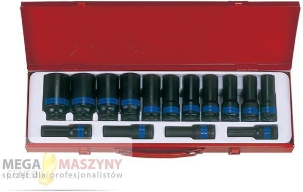 Zestaw nasadek udarowych 4415MP03 są niezbędnym narzędziem podczas prac w każdym profesjonalnym serwisie i warsztacie samochodowym. W skład zestawu wchodzi 15 nasadek w różnych rozmiarach przeznaczonych do kluczy pneumatycznych. Zostały wykonane z najwyższej jakości stali stopowej chromowo – molibdenowej, dzięki czemu są wytrzymałe i żywotne. Poza tym dzięki obróbce cieplnej zmniejszono kruchość materiału, z którego zostały wykonane i uzyskano odpowiednio wysoką twardość – odznaczają się odpornością na uszkodzenia mechaniczne oraz korozję. Dane techniczne zestawu nasadek udarowych 4415MP03: Rozmiary: 10, 11, 12, 13, 14, 15, 16, 17, 19, 21, 22, 24, 27, 30, 32 mm Kwadrat: 1/2 cala Wymiary kasety: 445 x 135 x 50 mm Waga: 4.9 kg W zestawie znajduje się 15 nasadek: 10, 11, 12, 13, 14, 15, 16, 17, 19, 21, 22, 24, 27, 30, 32. Zestaw w metalowej kasecie.