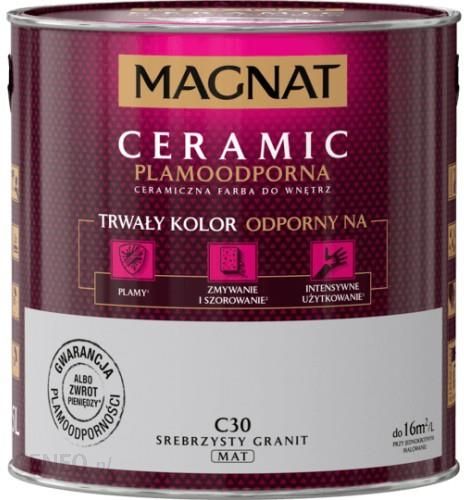 MAGNAT Ceramic to farba do ścian i sufitów, bazująca na najwyższej jakości ceramicznych komponentach, żywicach i pigmentach. Unikalna formuła gwarantuje trwałość koloru i jego odporność na plamy, zmywanie, szorowanie i intensywne użytkowanie. Farba MAGNAT Ceramic tworzy powłoki, które nie absorbują zabrudzeń i trudnych plam.Dostępne pojemności: 2.5L, 5LIlość warstw: 2Metoda aplikacji: wałek, natryskWydajność: do 16 m2/L przy jednokrotnym malowaniu