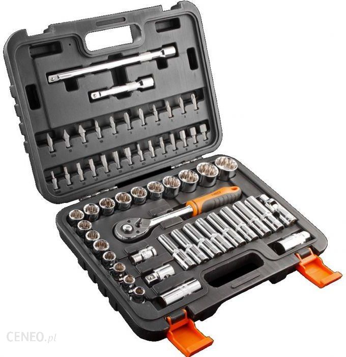 Zestaw kluczy nasadowych 1/2″ NEO (nr ref. 08-663) składa się z 58 elementów, wykonanych z wysokiej jakości stali chromowo-wanadowej. W skład zestawu wchodzi odgięta grzechotka, wyposażona w trwały mechanizm zapadkowy (72 zęby) i ergonomiczny uchwyt. Zestaw zawiera bogaty pakiet nasadek (w rozmiarach od 10 do 32 mm) i końcówek wkrętakowych (płaskie, krzyżowe, sześciokątne, Torx). Uzupełnieniem są przedłużki, pokrętło, przegub uniwersalny, adapter do bitów i nasadki do świec. Całość jest dostarczona w praktycznej i solidnej walizce z tworzywa sztucznego. Niezawodność produktu potwierdza 25-letnia gwarancja. Marka NEO spełnia oczekiwania profesjonalistów.