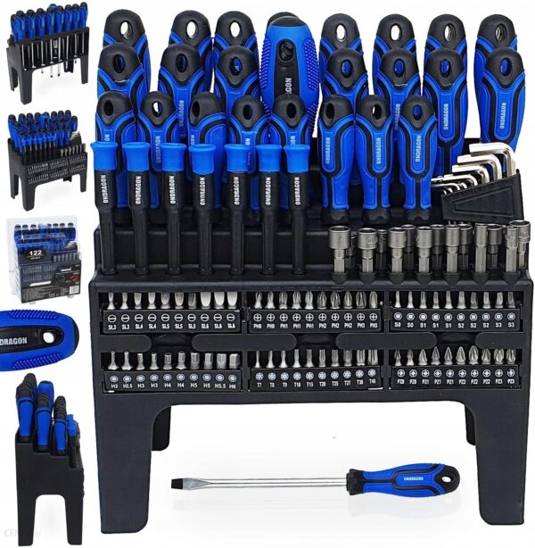 ZESTAW ŚRUBOKRĘTÓW (WKRĘTAKÓW), KLUCZY, NASADEK I BITÓW – 122 ELEMENTÓWCHROME VANADIUM / KOŃCÓWKI MAGNETYCZNE / STOJAKZestaw 122 elementy:8 wkrętaków płaskich: 8×150/6×150/6×100/5×125/5×100/5×75/4×100/3×75 mm6 wkrętaków krzyżowych: PH0x75/ PH1x75/PH1x100/PH1x125/PH2x100/PH2x150mm6 wkrętaków Philips: PH 0x75/1×75/1×100/1×125/2×100 /2x150mm4 wkrętaki Torx: T8x75/10×75/15×100/20×100 mm3 wkrętaki czworokątne: S0 0x75/1×75/1×100/2x100mm2 kątowe wkrętaki płaskie/Philips, USUNĄĆ8 wkrętaków precyzyjnych: płaskie:2,5×50/1,5×50 krzyżowe PH00x50/PH0x50 Typu torx T6x50/T7x50/T8x50/T9x50 mmwkrętak z wymiennymi końcówkami,10 bitów płaskich: 3/3/4/4/5/5/5/6/6/6mm10 bitów krzyżowych PH0/PH0/PH1/ PH1/ PH1/ PH2/ PH2/ PH2/ PH3/ PH310 bitów krzyżowych PZ0/PZ0/PZ1/ PZ1/ PZ1/ PZ2/ PZ2/ PZ2/ PZ3/ PZ310 bitów czworokątnych S0/S0/S1/S1/S1/S2/S2/S2/S3/S310 bitów imbus 2/2,5/3/3/4/4/5/5/5,5/6mm10 bitów torx T7/T8/T9/T10/T15/T20/T25/T27/T30/T40W zestawie również nasadki 14szt. 4/5/6/7/8/9/10mmZestaw 16 imbusów typu ,,L ‘’ 1,5/2/2,5/3/4/5/5,5/6StojakKońcówki magnetyczneZastosowanie końcówek magnetycznych w całym zestawie wkrętaków daje większe możliwości i precyzję wkręcania śrub w trudnodostępnych miejscach.Jakość materiałuUżycie wysokiej jakości materiałów takich jak stop chromowo wanadowy podczas produkcji śrubokrętów przedłuża ich okres żywotności oraz daje większą wyrzymałość.Chrom gwarantuje odporność stali na korozję, utlenianie, ścieranie i dużą wytrzymałość w wysokiej temperaturze. Dodatek wanadu hamuje wzrost ziaren podczas obróbki termicznej, zwiększając jednocześnie ciągliwość zarówno postaci hartowanej, jak i odpuszczonej.Zestaw śrubokrętów i bitów sprawdzi się w każdym garażu czy warsztacie. Dołączony w zestawie stojak ułatwia przechowywanie śrubokrętów. Z tyłu stojaka znajdują się 2 otwory montażowe umożliwiające powieszenie całego zestawu na ścianie.Ergonomiczna konstrukcjaZestaw wkrętaków został zaprojektowany w taki sposób aby był idealnie dopasowany do każdej proporcji dłoni. Ogumienie i wypustki zapewniają brak poślizgu co ułatwia pracę narzędziem.Wysokiej jakości komplet bitów to niezbędne wyposażenie każdego warsztatu oraz garażu.Dzięki odpowiedniemu dobraniu elementów zestawu jest on niezwykle uniwersalny. Zastosowanie odpowiednich materiałów zapewnia wysoką wytrzymałość oraz trwałość.Całość zamknięta w walizce z tworzywa sztucznego.Zastosowanie końcówek magnetycznych w zestawie wkrętaków daje jeszcze większe możliwości i precyzję wkręcania śrub w trudnodostępnych miejscach!ORYGINALNE OPAKOWANIEGALERIA AUKCJI: