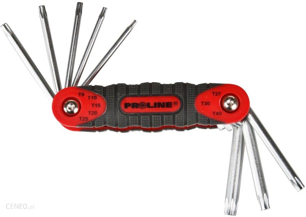 48388 Klucze Torx CrV zestaw 8 elementów T9-T40, ProlineKlucze Torx CrV, 8szt, T9-T40, Proline 48388:Stal o wysokiej odporności na ścieranie i skręcanie.Twardość 56-60HRC.Metalowa skuwka pokrywana miękkim tworzywem.Skład zestawu: T9, T10, T15, T20, T25, T27, T30, T40.