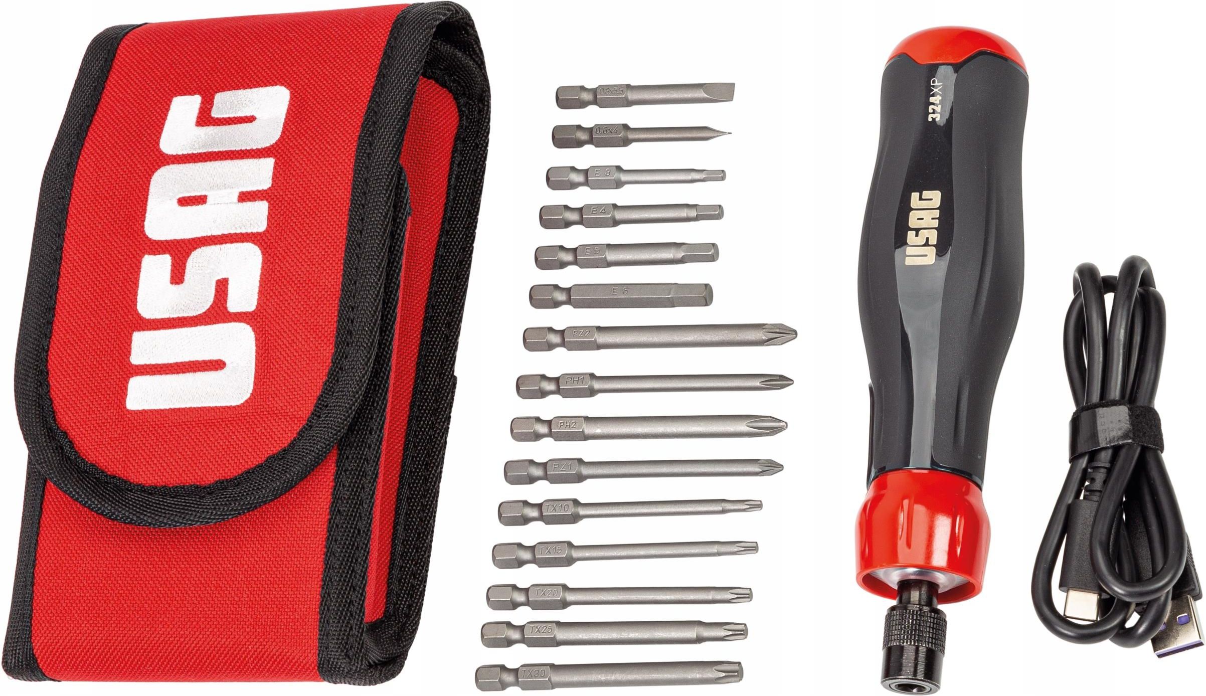 Zestaw USAG 324XP/B16 Śrubokręt z napędem elektrycznym + zestaw bitów 1/4″Chciałbyś ułatwić sobie pracę i dać odpocząć nadgarstkom? Wysokiej jakości wkrętak USAG 324 1/4″ to idealna propozycja dla elektryków, monterów i mechaników. Automatyczny mechanizm obrotowy z automatyczną blokadą o jakości gwarantowanej przez USAG/FACOM to lata bezproblemowej i komfortowej eksploatacji dla każdego, kto ceni sobie rozwiązania ułatwiające pracę.Wewnętrzny silnik elektryczny zapewniający prędkość 300 obrotów/minKompaktowy rozmiarBateria litowa 3,6 V 2,0 AhMagnetyczny uchwyt do bitów 1/4″ z nakrętką do szybkiego zwalniania5 przednich diod LED z automatycznym wyłączaniem po 10 sekundachAutomatyczny system blokowania wrzeciona do dokręcania ręcznegoErgonomiczny gumowy uchwyt odporny na oleje i chemikaliaStopień ochrony IP54Możliwość ładowania przez kabel USB-C (w zestawie)Dioda wskazująca stan naładowaniaLink do prezentacji video produktu: https://www.youtube.com/watch?v=kLUof7EXB34Zestaw USAG 324 XP/B16324 XP – Wkrętak elektryczny664 – Wkładki pod wkręty z rowkiem – napęd 1/4″20,6×4-0,8×5,5664 E – Końcówki do śrub imbusowych – napęd 1/4″43-4-5-6664 PH – Końcówki do śrub krzyżakowych PHILLIPS® – napęd 1/4″21-2664 PCS – Wkładki do śrub krzyżakowych POZIDRIV® – SUPADRIV® – przyłącze 1/4″21-2664 TX – Końcówki do śrub TORX® – napęd 1/4″5T10-T15-T20-T25-T30324 XP / BV – Puste etui nylonowe1Elektryczny mechanizm USAGDzięki innowacyjnemu silnikowi zintegrowanemu z mechanizmem blokady, wkrętak USAG 324 XP dysponuje mocą 0,9 Nm przy obrotach 300 obr/min.Jednocześnie dzięki automatycznej blokadzie wytrzymuje obciążenie ręczne do 10 Nm, co pozwala na korzystanie z niego jak ze standardowego wkrętaka.Firma 4techtools jest autoryzowanym przedstawicielem marki USAG na Polskę. Dzięki temu możemy zaoferować Państwu najwyższej jakości narzędzia prosto od producenta. Kupując od 4techtools zyskujesz gwarancję najlepszej ceny, dostępność i gwarancję oryginalności. Potrzebujesz większych ilości narzędzi lub czegoś, czego nie mamy na aukcjach? Skorzystaj z zakładki kontakt!