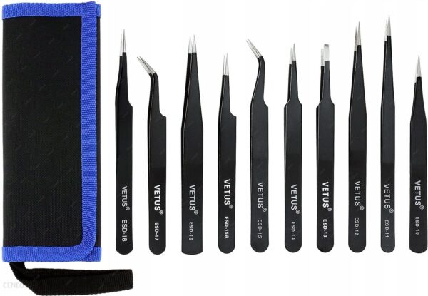 NWA0000869ZESTAW 10 PINCET ESD VETUS + ETUIPINCETY ANTYSTATYCZNE, ANTYMAGNETYCZNE HQW zestawie znajdują się następujące metalowe pincety VETUS:Pinceta ESD-10 szeroka, krótka (12,2cm)Pinceta ESD-11 wąska, długa (14cm)Pinceta ESD-12 szeroka, średniej długości (13,3cm)Pinceta ESD-13 szeroka, z prostokątną końcówką (12,2cm)Pinceta ESD-14 szeroka, zwężana na końcówce, krótka (12,2cm)Pinceta ESD-15 szeroka, zagięta 45° (12,5cm)Pinceta ESD-15A szeroka, prosta (11,6cm)Pinceta ESD-16 najszersza, krótka (12,6cm)Pinceta ESD-17 szeroka, zagięta 30° (11,3cm)Pinceta ESD-18 wąska, prosta (12,5cm)oraz praktyczne etui 20x17cm (po rozłożeniu) zapinane na rzep z uchwytem.Wszystkie pincety oznaczone w naszym sklepie HQ reprezentują wysoką jakość wykonania!Potrzebujesz inne akcesoria serwisowe i lutownicze – sprawdź nasze pozostałe aukcje.