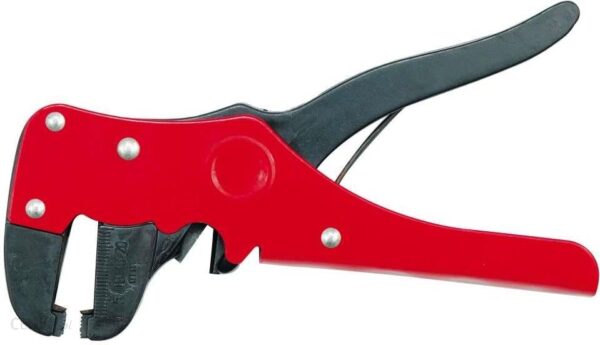 Wykonane z tworzywa i blachy automatyczne szczypce do ściągania izolacji z przewodów Podczas jednej operacji ostre szczęki przecinają i ściągają warstwę plastiku z obrabianej końcówki Naniesiona na szczęce milimetrowa podziałka pozwala na szybkie zmierzenie odizolowywanego kawałka W dolnej części szczypiec dodatkowe ostrze do cięcia
