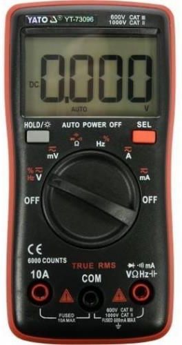 Miernik uniwersalny YT-73096 z funkcją TRUE RMS oraz z automatycznym zakresem dla każdego pomiaru. Umożliwia wykonanie podstawowych oraz zaawansowanych pomiarów wielkości elektrycznych. Popularna obudowa, niewielkie wymiary oraz duży podświetlany wyświetlacz to połączenie wysokiej mobilności z wygodą pracy. Szybkość, dokładność i powtarzalność wskazań multimetr zawdzięcza nowoczesnej konstrukcji płytki sterującej oraz wysokiej jakości sondom pomiarowym, których rozmiar i precyzję docenią zarówno hobbiści jak i profesjonalni serwisanci.PODSTAWOWE POMIARY pomiar napięcia przemiennego: A.C. 0-750V, TRUE RMS pomiar napięcia stałego: D.C. 0-1000V pomiar natężenia prądu przemiennego: A.C. 0-10A, TRUE RMS pomiar natężenia prądu stałego: D.C. 0-10A pomiar rezystancji: 0-60M? test diody: IF 5mA, UR 3V test ciągłości obwodu: 0-50?EAN: 5906083072239