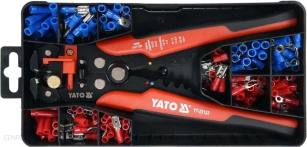Zestaw konektorów izolowanych z wielofunkcyjnymi szczypcami YT-23133. Korpus szczypiec wykonano ze stali A3, a elementy ściągające izolację z wytrzymałej hartowanej stali narzędziowej ze stopu Cr12MoV. Rękojeści zabezpieczone dwukomponentowymi nakładkami z tworzywa sztucznego. Twardszy komponent z PP mocno przylega do korpusu, a zewnętrza część z TPR jest przyjemna w dotyku i posiada antypoślizgowe właściwości. Szczypce zabezpieczono przed korozją za pomocą metody oksydowania. Konstrukcja szczypiec umożliwia ściąganie izolacji zarówno z końcówek jak i ze środka przewodu. Ogranicznik głębokości sprawdza się podczas montażu przewodów np. w łącznikach czy w kostkach typu wago.mechanizm szybkiego i automatycznego ściągania izolacji zarówno z przewodów płaskich jak i okrągłych w zakresie od 0,2 mm2 do 6,0 mm2końcówki szczęk roboczych wykonane wytrzymałej stali narzędziowej Cr12MoVmożliwość cięcia przewodówmożliwość zaciskania konektorów zaciskowychmożliwość zaciskania konektorów izolowanychSzczypce YT-23133 tabela zastosowania:SKŁAD ZESTAWU YT-23133:wielofunkcyjne szczypce do izolacji oraz zaciskania konektorówczerwone i niebieskie konektory izolowane typ oczko: po 20 sztukczerwone i niebieskie konektory izolowane typ widelec: po 20 sztukczerwone i niebieskie konektory izolowane typ nasuwka damska: po 20 sztukczerwone i niebieskie konektory izolowane typ wsuwka męska: po 20 sztukczerwone i niebieskie łączniki izolowane: po 10 sztukczerwone nasuwko-wsuwki izolowane typu piggy-back: 10 sztuk