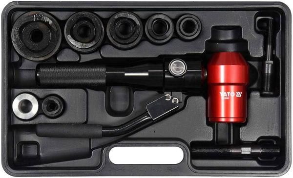 Zestaw do wycinania okrągłych otworów w blachach w zakresie średnic od 22-60 mm. Głowica ręcznego siłownika hydraulicznego może być obracana o 360 stopni. Przeznaczony jest do wycinania otworów przy produkcji szafek rozdzielczych do montażu puszek lub przełączników . Podczas wycinania otworów, powierzchnia blachy nie ulega deformacji i uszkodzeniom. Zestaw jest łatwy w transporcie- zapakowany w trwałą walizkę. Zawiera matryce i stemple wycinające otwory o średnicach 22 mm/0,9″, 27,5 mm/1,1″, 34 mm/1,3″, 43 mm/1,7″, 49 mm/2,0″, 60 mm/2,4”. Nacisk na materiał podczas wycinania wynosi ok. 6 ton. Nadaje się do wycinania otworów w blachach stalowych , blachach nierdzewnych i metalach kolorowych . Grubość wycinanego materiału zależnie od jego rodzaju do ok 3 mm . W zestawie znajduje się 6 par wykrojników /stempel i matryca/ fi 22, 27.5, 34, 43, 49, 60 mm , 2 trzpienie do mocowania 7/16×3/4 cala i 3/4×3/4 cala , ręczny siłownik oraz 1 zestaw uszczelniającyPrzeznaczenie / Zastosowanie:Do szybkiego wycinania w blachach , dużych , precyzyjnych otworów o średnicach od 22-60 mmSposób użycia:Zgodnie z dołączona instrukcją obsługi .Przez przewiercony materiał przełożyć odpowiedni trzpień mocujący połączony z siłownikiem , zamontować na nim z jednej strony materiału stempel z drugiej matrycę . Za pomocą siłownika ściągnąć trzpień powodując przecięcie materiału.Ręczny siłownik z obrotowa głowicą ,Stemple wycinające 22 MM/0,9″, 27,5 MM/1,1″, 34 MM/1,3″, 43 MM/1,7″, 49 MM/2,0″, 60 MM/2,4Matryce odpowiednie do stempli- 22 MM/0,9″, 27,5 MM/1,1″, 34 MM/1,3″, 43 MM/1,7″, 49 MM/2,0″, 60 MM/2,4Trzpienie do mocowania 7/16X3/4 CALA I 3/4X3/4 „.,Zestaw uszczelniającyCałość zapakowana w walizkę.**Zdjęcia pełnią funkcję poglądową….